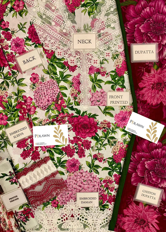 Embroidered Lawn 3 Piece Unstitched Suit CSSL-HU-D07-A-FLORAL MESH-ROSE PINK - Summer Collection