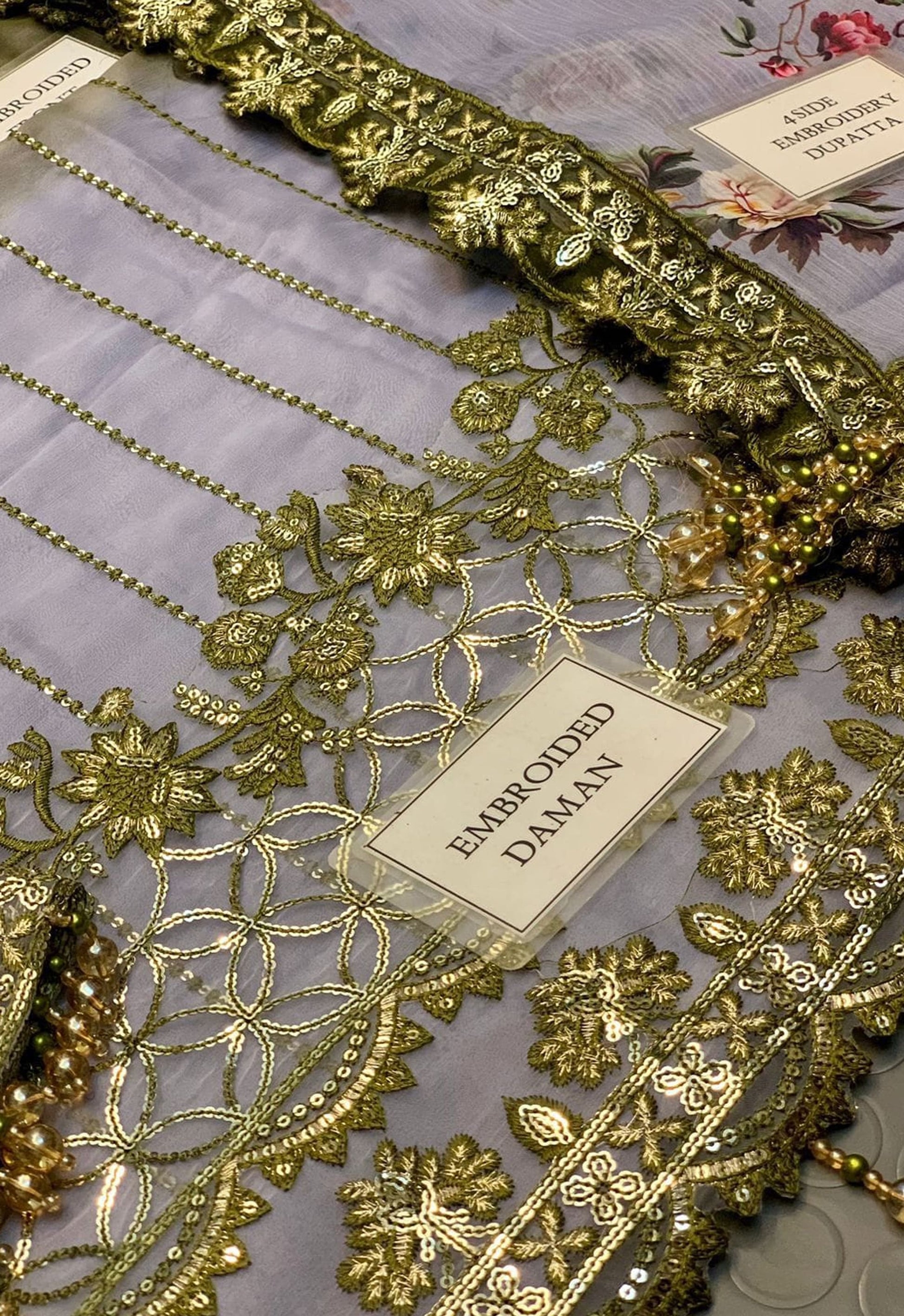 - Chiffon digital printed dupatta with 4 side heavy embroidered spangle work lace attach with 4 side fancy tulses attach