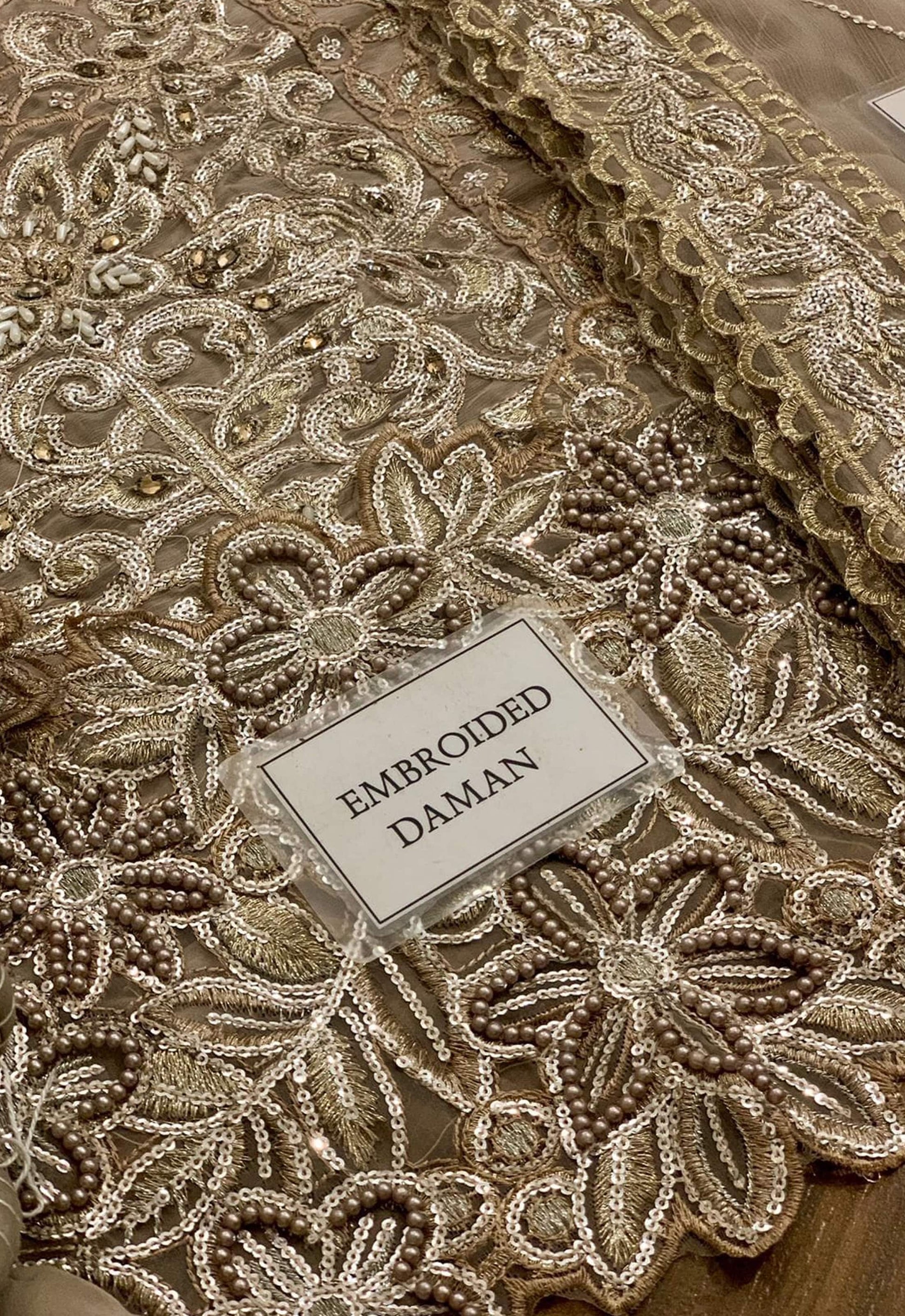- Chiffon fully heavy embroidered spangle work center panel with fully heavy hand embellishment adha work center panel with fully heavy embroidered spangle work left & right panel attach with fully hand embellishment adha work with heavy embroidered spangle work daman border with heavy hand embellishment adha work neckline lace fully embellishment adha work