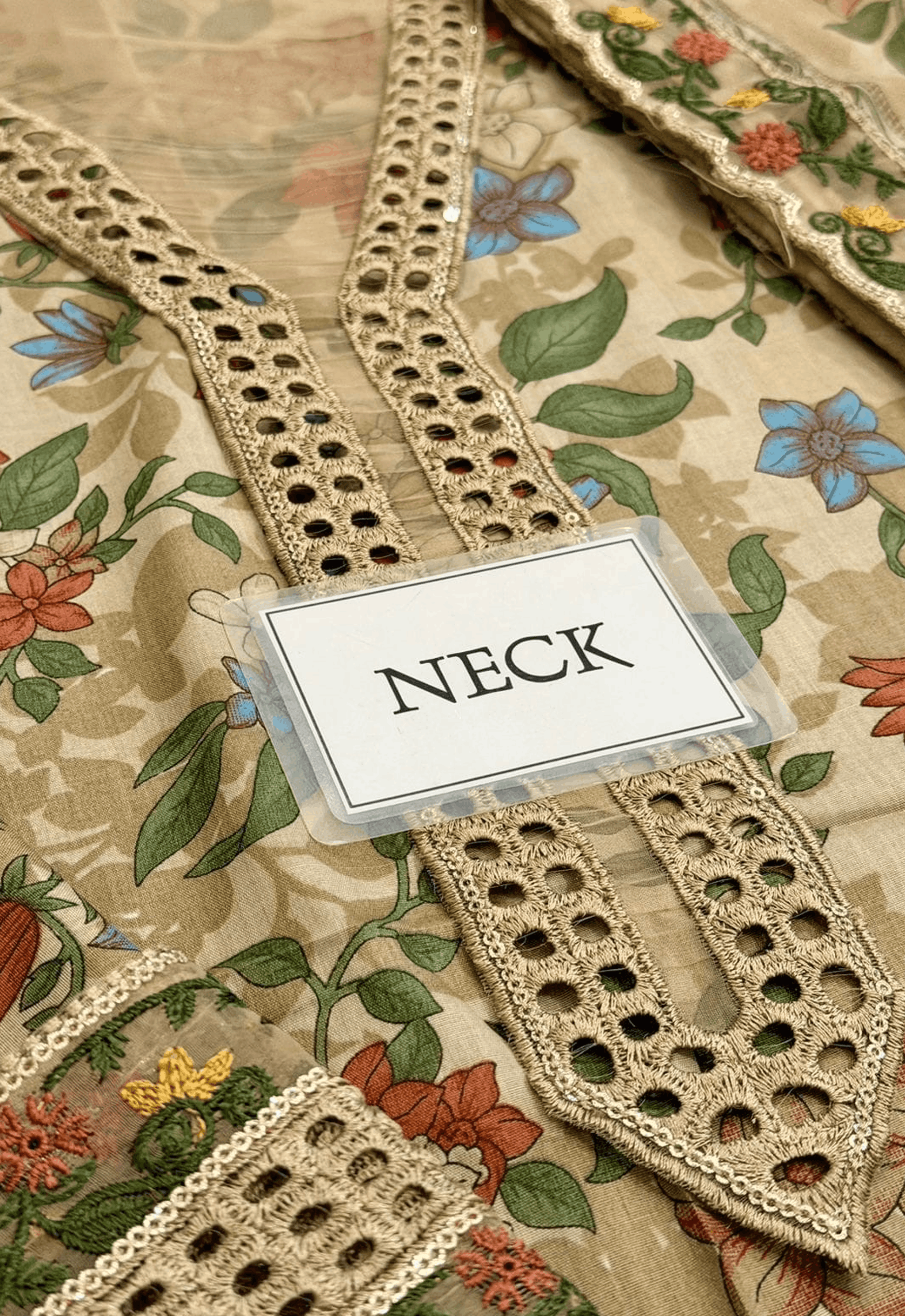 - Printed lawn front with heavy schifflie embroidered spangle work neckline with heavy embroidered spangle work daman border