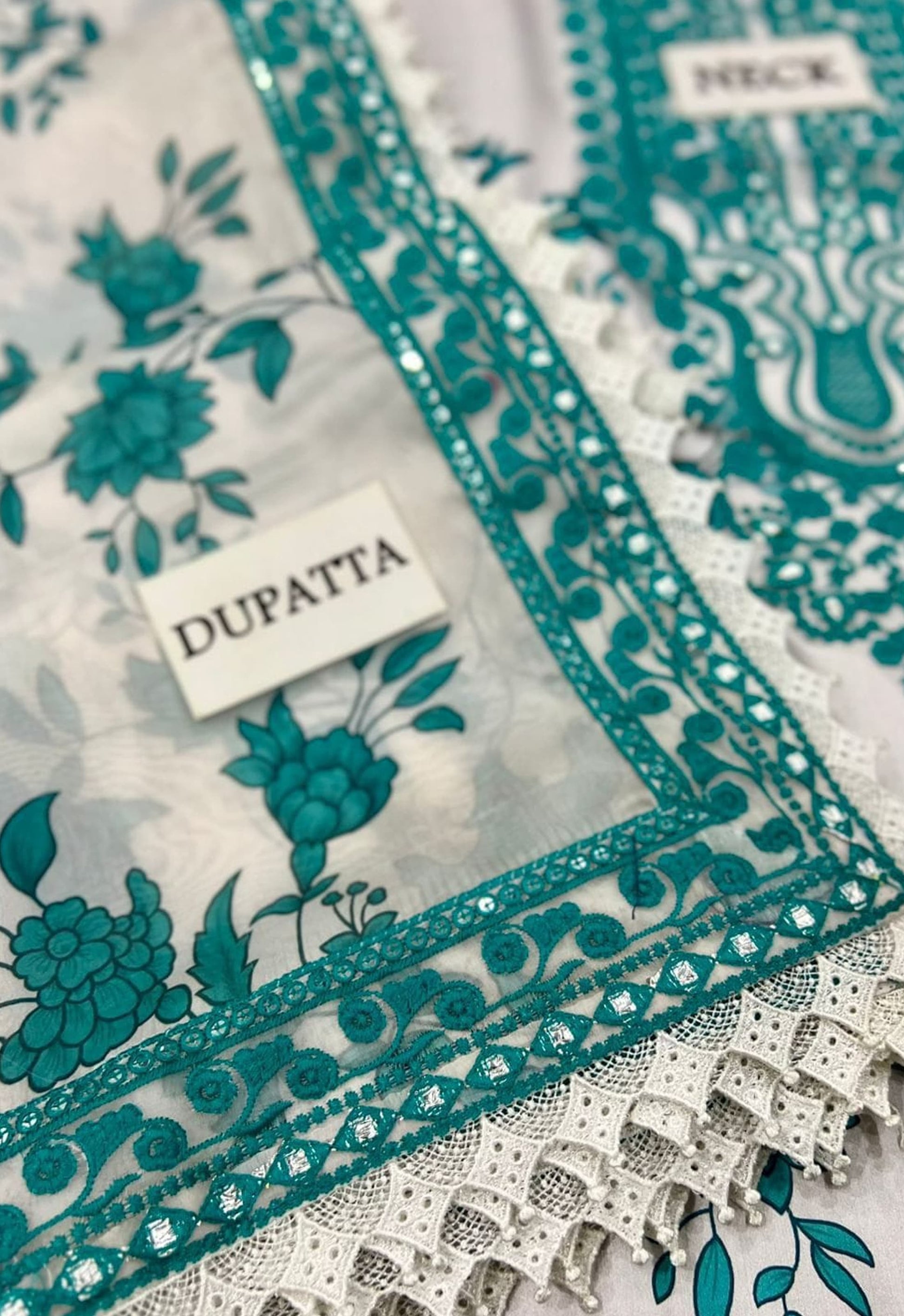 Silk digital printed dupatta with 4 side heavy embroidered foil & spangle work border attach with schifflie lace attach