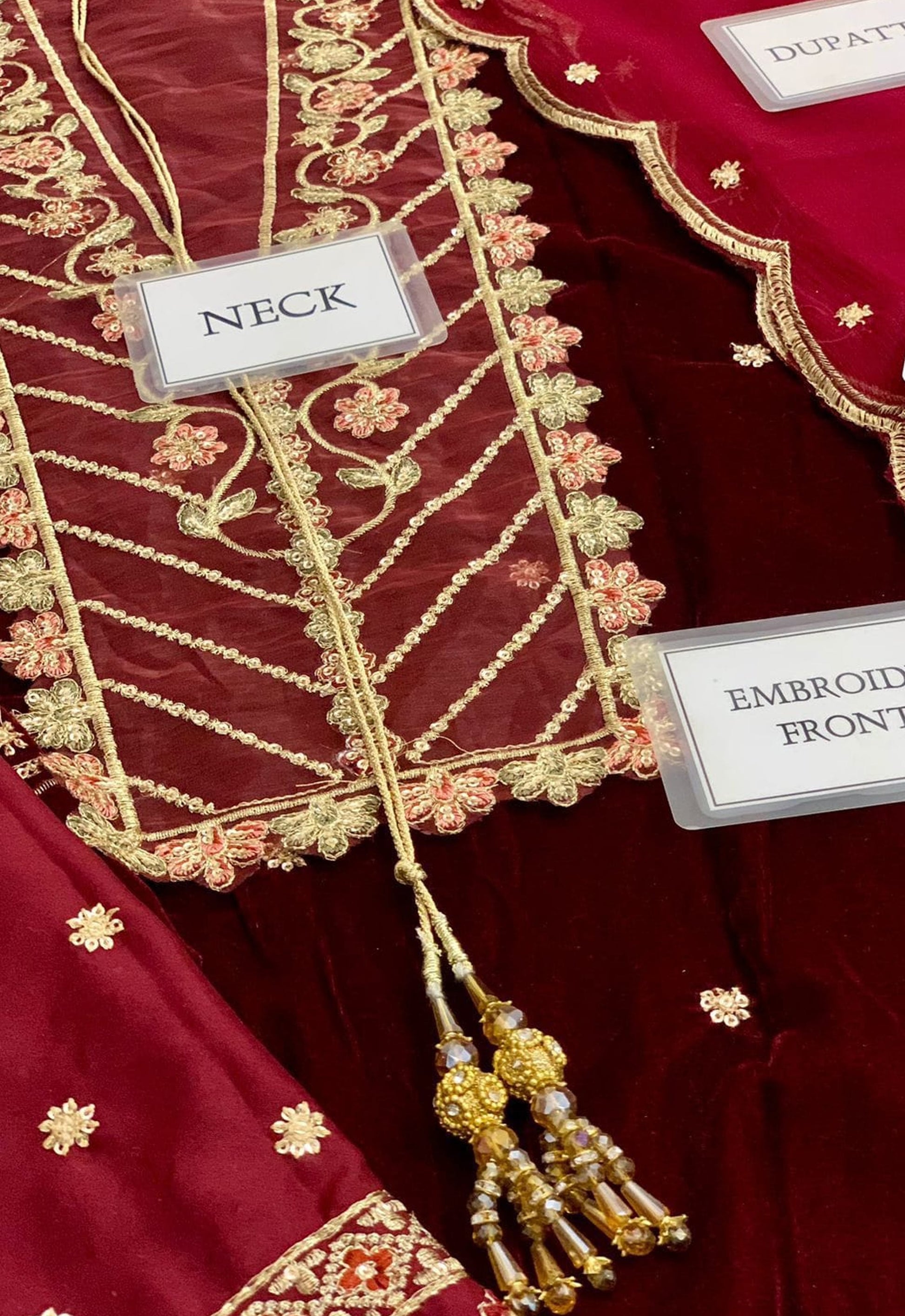 - Velvet fully heavy alternate embroidered spangle work front with cut work with embroidered spangle work neckline with neck fancy tulses