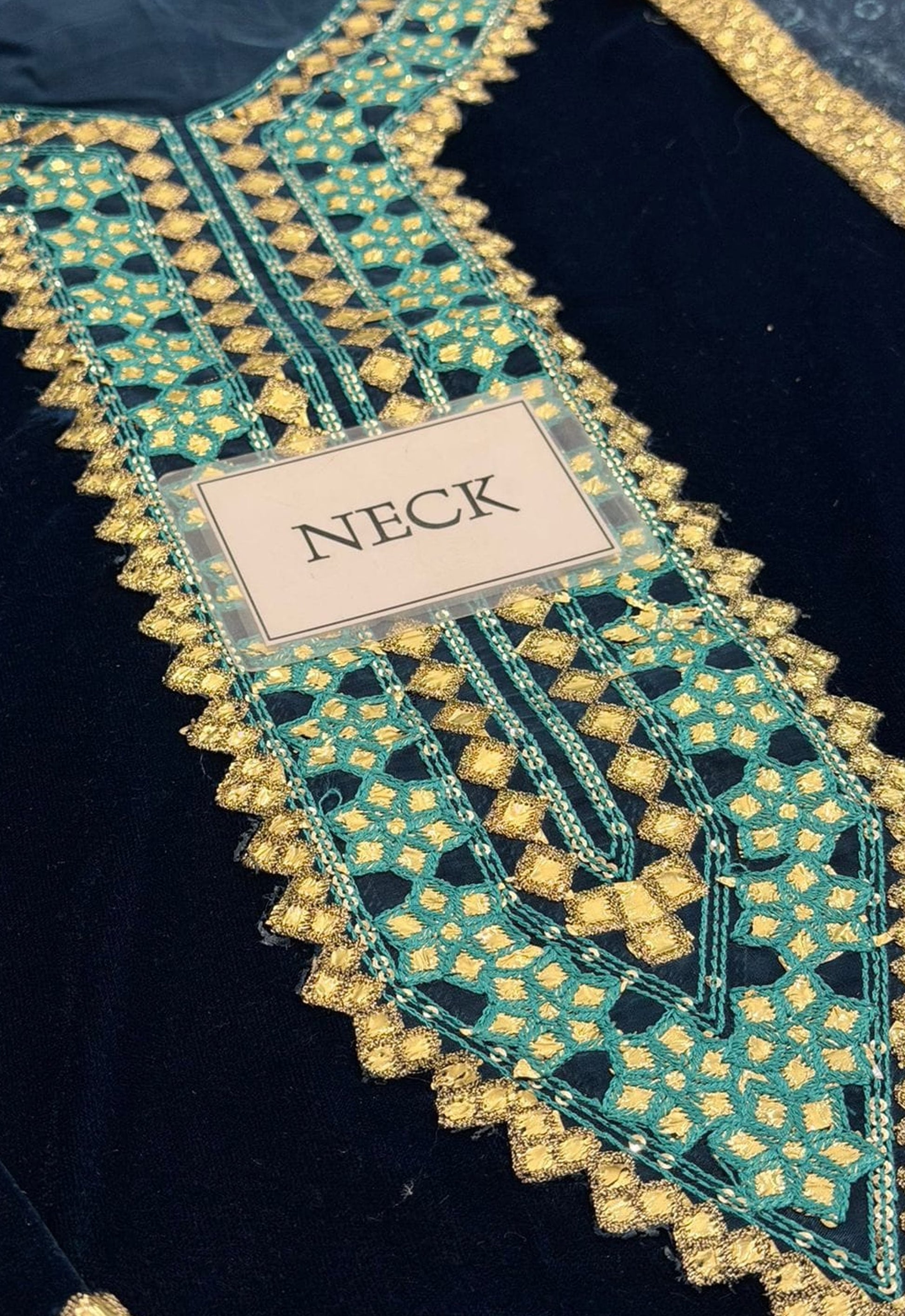 - Velvet fully heavy alternate embroidered spangle & foil work front with embroidered spangle & foil work daman lace & chak lace